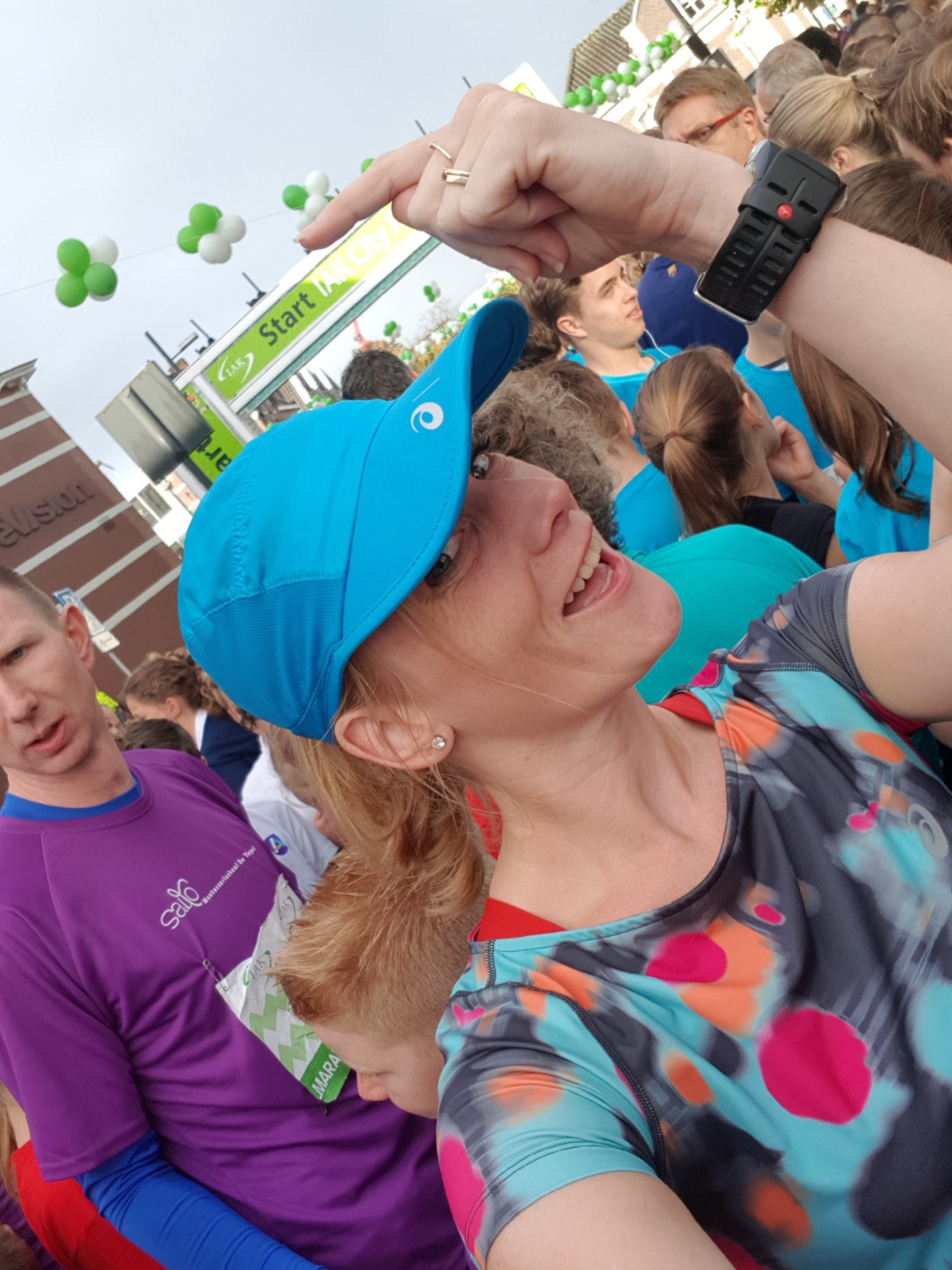 De wekker ging, omdat alles klaar lag konden we vrij snel aangekleed naar beneden genieten van het uitgebreide ontbijt van het hotel. Erg veel zin in eten had ik helemaal niet maar gelukkig won mijn verstand en heb ik goed ontbeten. Op weg naar de start begon de zon te schijnen en was ik blij dat ik in een t-shirt was gaan rennen. Voor de start werd er natuurlijk nog wel even een startvak selfie gemaakt. Er werd nog even met het thuisfront geappt om vervolgens af te tellen en samen met heel veel andere mensen maar vooral kinderen van start te gaan.