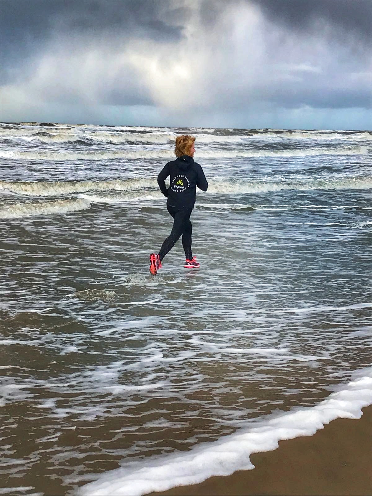 De elastieken kwamen weer tevoorschijn en fanatiek werd er door iedereen meegedaan! Ik vind het altijd een leuk onderdeel, lekker even op het einde voluit gaan! Tijd om alweer terug te gaan. Intervallen was het plan, 1 minuut op en 1 minuut af en op het strand 30 sec hard en 1 min wandelen. We mochten natuurlijk tijdens de interval de strandopgang op rennen in die ene minuut. Maar eenmaal boven mochten we er ook weer afrennen. Dit ging prima, was het niet zo dat ik na die strand opgang wel voluit voorover op mijn plaat ging! Ik lag langgerekt op mijn buik in het zand, na even mijzelf keihard uitlachen snel opstaan en verder rennen. Tijdens rust voor de laatste 30 seconden besloot de zee mijn voeten nat te maken en ik besloot daar gebruik van te maken. Als je toch al nat bent dan maar door de zee heen rennen!
