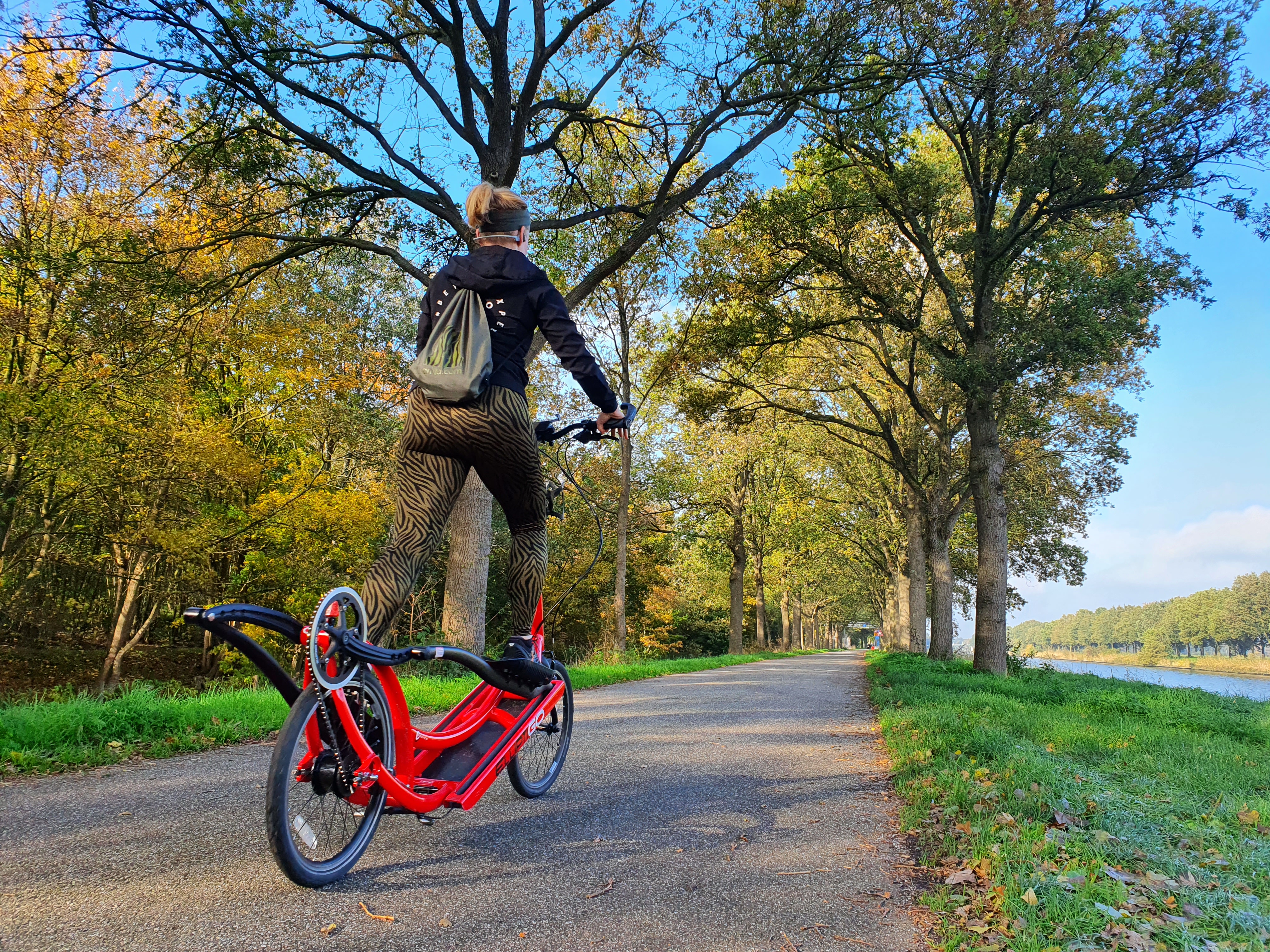 Toen ik bij Roelof (Elliptigo Drenthe) de elliptigo ophaalde heeft hij goed geholpen om deze achter in de auto te leggen. Eenmaal thuis toch een keer de straat op en af en vervolgens was het een kwestie van rustig opbouwen. In het begin vond ik het sturen eng, ik ben nogal snel bang aangelegd, de eerste paar bochten op de race fiets vond ik immers ook heel spannend. De elliptigo heb ik vooral ingezet voor het onderhouden van mijn conditie toen mijn enkel dat weer aan kon. Zo heb ik dus de intervaltrainingen gedaan maar ook veel langere lopen. Ik begon klein met een 5 km maar als je dan na 15 min alweer terug bent wil je toch wel wat meer. Ik ging niet meer op aftand trainen maar op tijd op de Elliptigo. Ondertussen bouwde ik het hardlopen zelf ook op. Op de Elliptigo durfde ik niet goed in het donker te trainen. Dit maakte dat ik er enkel in de weekenden op ging staan. Een lange duurloop was dan vaak wel mijn voorkeur. Ik maakte zo mooie tochten, ik had een rugtasjes op met wat eten en een bidon in de bidon houder waardoor ik op een dag voor de marathon afstand ging. Het was een rustige duurtraining en na de 42,2 km besloot ik hem rond te maken tot de 50 km!