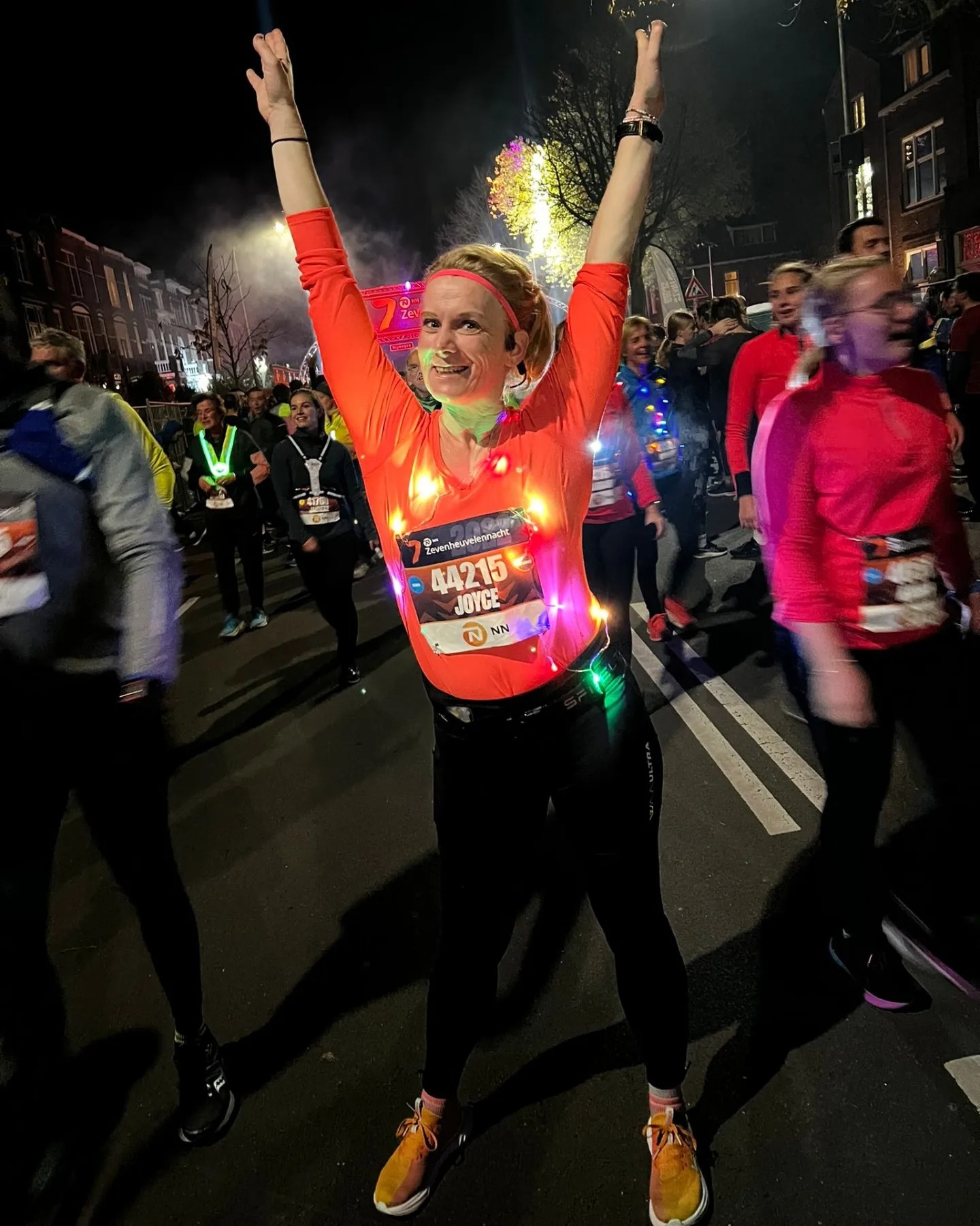 De start werd aangekondigd en een paar minuten later liepen wij dan ook door de trechter start het parcours op. De route was voor mij en Mirjam niet onbekend maar beide keken we wel uit naar het 2 km punt. Daar zou namelijk de NN lichtstraat zijn en dit was eerder (vond ik) een heel donker stuk op het parcours. We hadden het tempo er lekker in maar ik besloot de lichtstraat te gaan filmen. Het was namelijk wel heel leuk opgezet, veel verlichting, muziek en een toffe speaker! Ik liep de hele tijd te filmen om na de lichtstraat er achter te komen dat ik dus niet gefilmd had, haha. Het mooie is dat ik de route ken en weet dat er nog zo’n toffe straat aan gaat komen, ik noem het altijd de vivaldi straat. Dat draaiden ze toen ik daar tijdens mijn 1e keer zeven heuvelen nacht door heen rende. Wederom een donkere straat, met overigens slecht wegdek en aan weerszijde verlicht door een lange lichtslang op de grond, dit keer kreeg ik er helemaal een Efteling gevoel bij. We lopen nog steeds op tempo en check bij Mirjam of het oké is, maar ze knikt of zegt ja dus lopen we door. Bij de waterpost, sloegen we beide de mogelijkheid tot drinken over. Echter vond ik het daar wel het moment om van dichtbij even te kijken hoe de straat stenen er daar uit zagen, gelukkig kon ik net voorkomen dat ik ze zou voelen, maar ik struikelde flink over de allerlaatste mat van de tijdsregistratie. Die mogen ze wat mij betreft volgend jaar ook wel verlichten.. Gelukkig ging dat goed. Voor je het weet zit je dan ook al weer op de weg naar beneden, die lang is en wat ik heerlijk vind lopen. Samen zette we nog een tandje bij en liep ik nog een beetje van links naar rechts om nog redelijk wat high fives uit te delen. Ook krijgen Mirjam en ik nog redelijk veel respons uit het publiek over onze gekleurde lampjes.