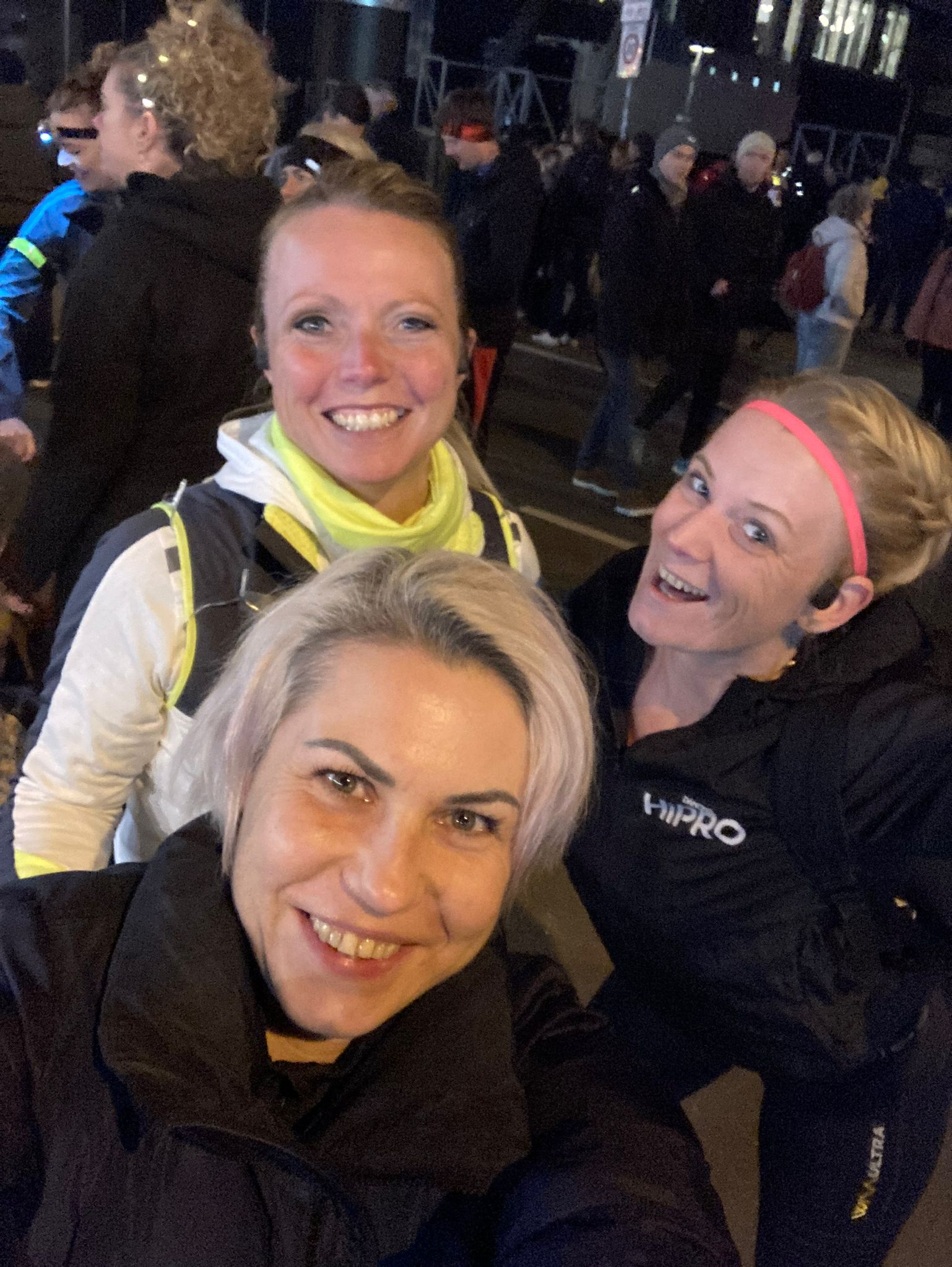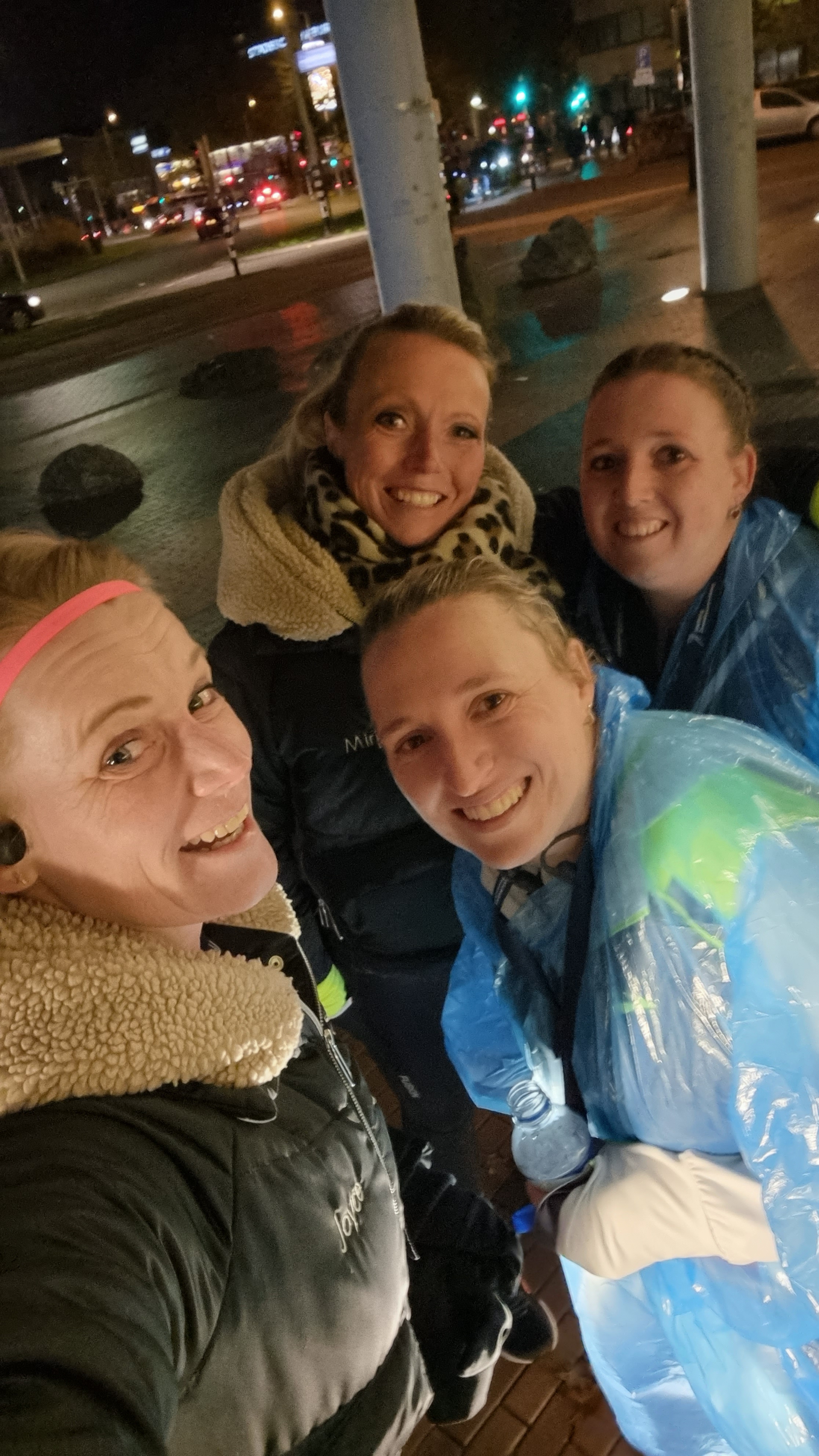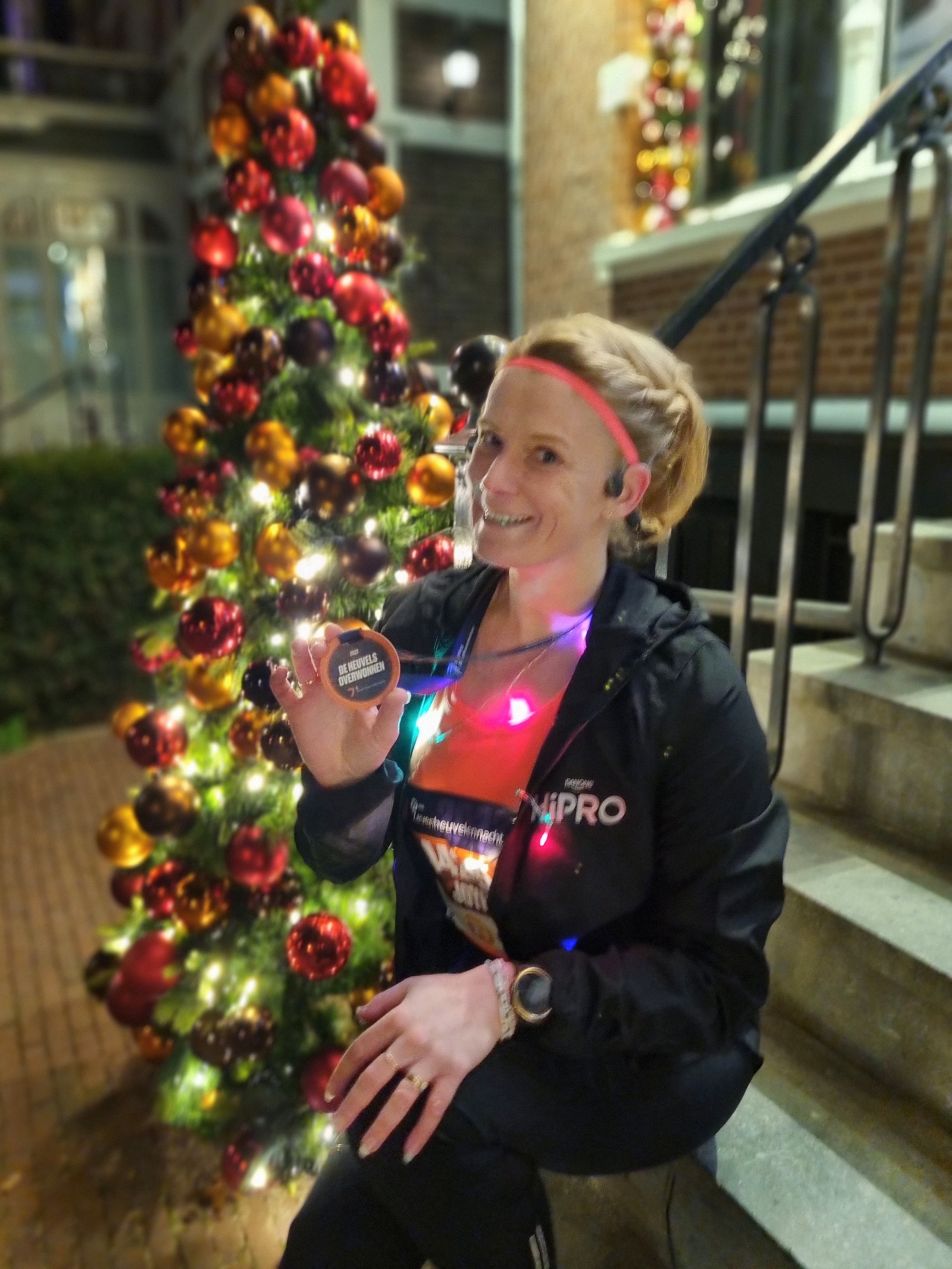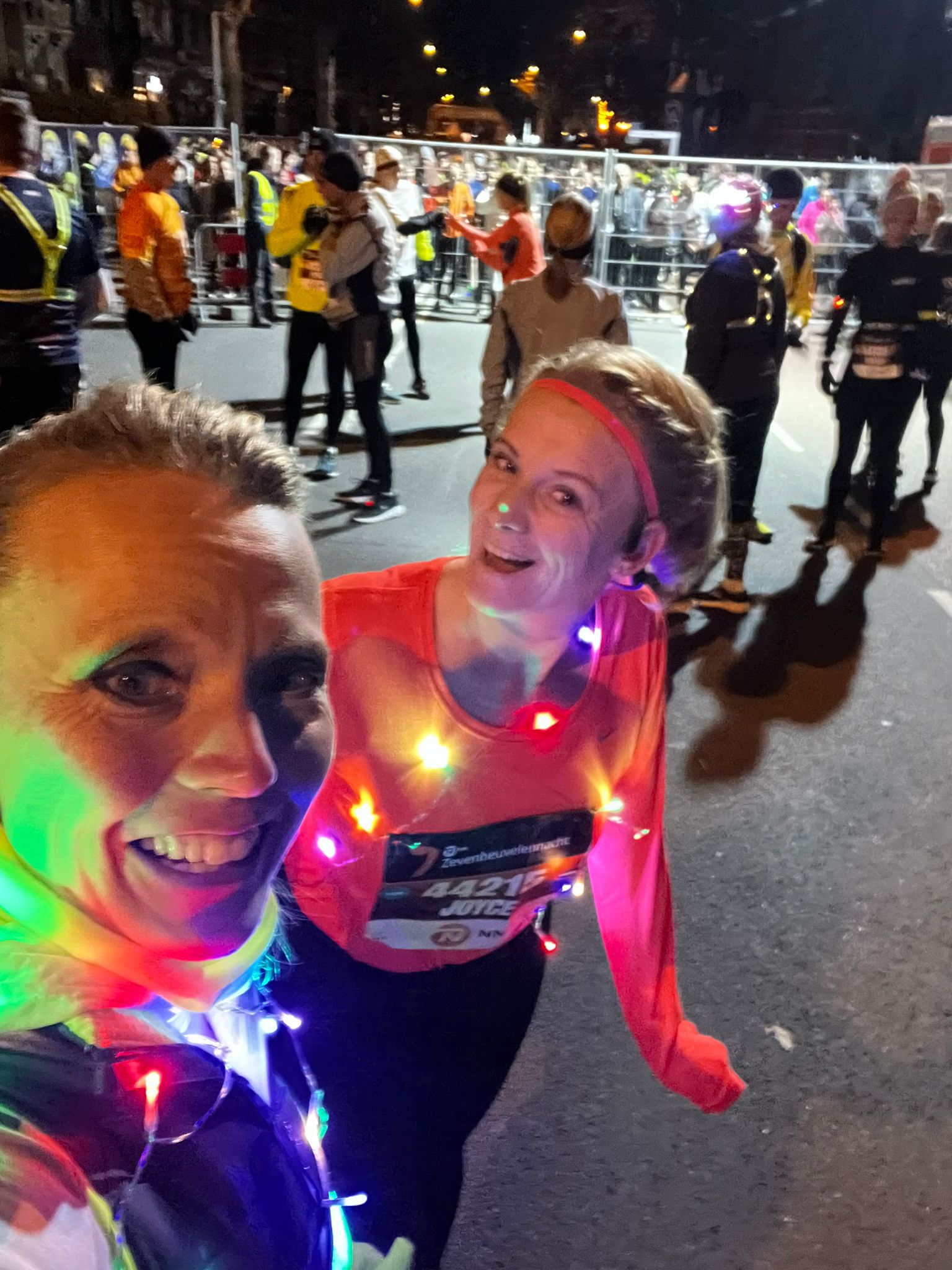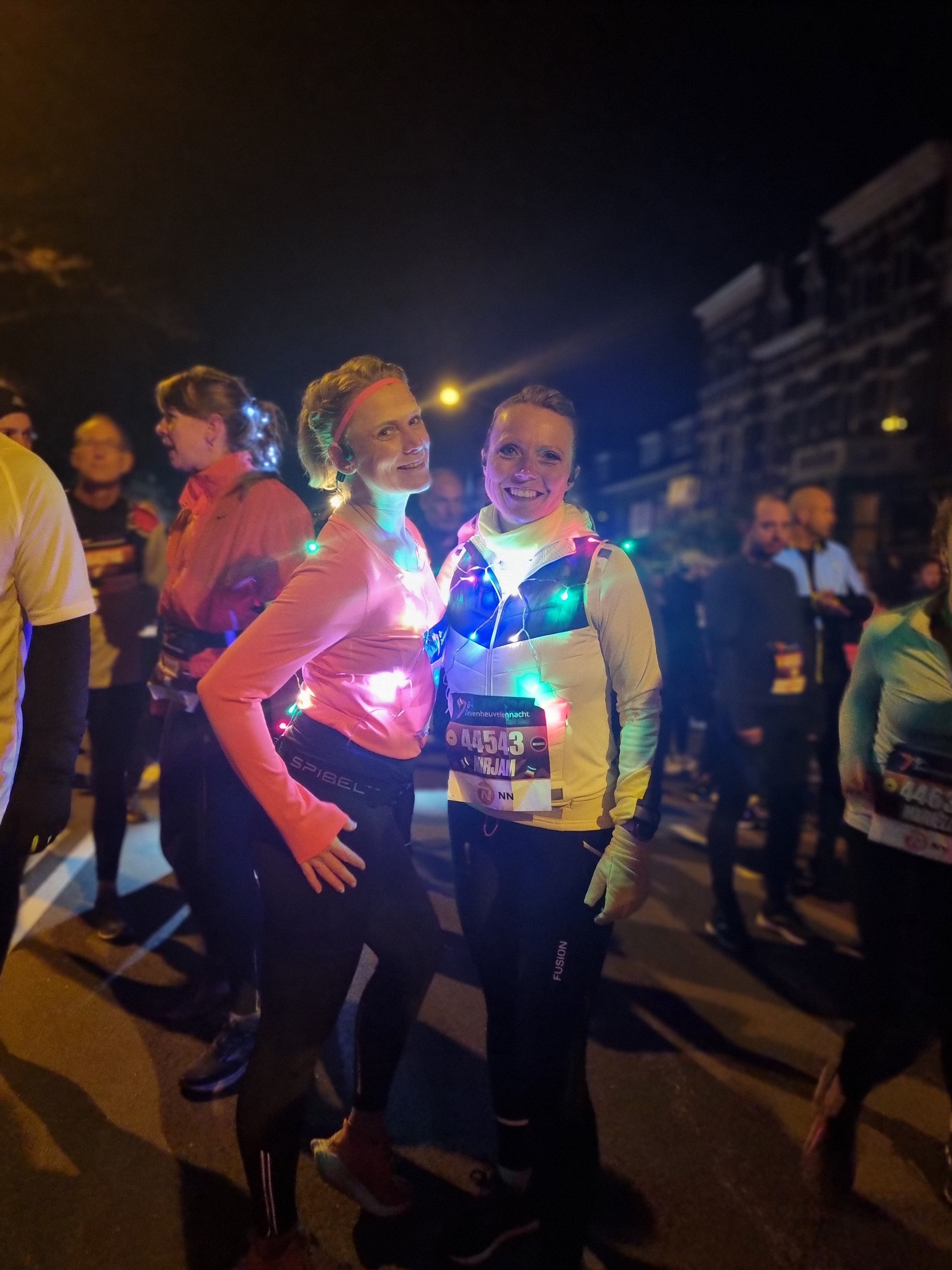 We hadden geen tijdsdoel, lekker lopen en genieten was het doel, daarom hadden we onszelf ook versierd met gekleurde lampjes, een beetje gek mag wel toch! We waren met de auto naar Nijmegen gereden en konden nog bij het keizer Karel plein parkeren. Kom op tijd is daarin key want het was flink druk in de parkeergarage. We kozen ervoor om ons bij de auto ‘klaar te maken’. Lees de compressie kousen aan te doen, startnummer op te spelden. We stonden daar namelijk droog en hadden gehoopt dat de parkeergarage lekker warm zou zijn. Helaas, als je uit een warme auto stapt valt dat wel een beetje tegen. Terwijl wij ons startnummer op spelden en lampjes om deden, kwam Aleksandra aanlopen. Ze was nog niet eerder bij de zevenheuvelennacht geweest en vroeg of ze met ons kon mee lopen. Tuurlijk was ons antwoord en zo liepen we vervolgens met zijn drieën naar de start. Ik had een jasje aangelaten en mijn rugtas met warme en evt droge kleding meegenomen, in de hoop dat ik die dan zou kunnen inleveren, wat gelukkig wel kon. Ik moet eerlijk zeggen dat is bij de zevenheuvelenloop altijd wel goed geregeld. Je komt namelijk aan lopen en loopt eerst langs de ‘garderobe/tasseninname’ alvorens je naar het startvak kan lopen. Mijn kledingkeuze werd lang lang, dus geen jasje en zonder handschoenen. In het startvak kreeg ik daar een beetje spijt van, maar eenmaal tijdens het rennen had ik prima in een T-shirtje kunnen rennen. Wat ik wel miste dit jaar was de overdekte expo. Er stonden wel wat kraampjes maar om eerlijk te zijn vond ik dat niet echt veel voorstellen, ook mis je daardoor een beetje sfeer vond ik persoonlijk en ja ik vind die beursaanbiedingen ook altijd wel leuk haha.