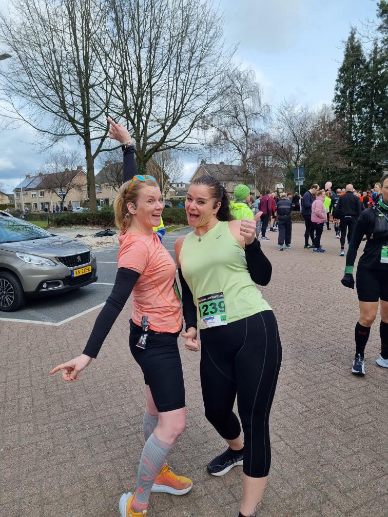 Het grote verschil met Vorden en de Midwintermarathon is toch wel dat de wedstrijd in Vorden een heel stuk vlakker is. Wel ben ik zelf een stuk rustiger, al vind ik het nog wel heel spannend. Bij aankomst besluit ik direct even naar het toilet te gaan, er staat al een rij, niet wetende dat je ook nog elders een toilet hebt en een toiletwagen. Ik besluit te wachten wanneer het wordt benoemd, het is best gezellig. In de sporthal is het al druk, de halve marathon en de 30 km starten tegelijk. Ik kijk even rond, ik weet dat een aantal bekenden er rondlopen, maar ik zie ze niet. Ik ga lekker aan de rand een plekje zoeken. Terwijl ik me omkleed kom ik gezellig aan de klets. Ik houd ervan, ik vind het namelijk altijd spannend om alleen naar een loop toe te gaan, maar ik heb me echt vermaakt! Waar de 30 km’s allemaal (bijna) trainen voor een toffe marathon, kom je al snel op de marathon verhalen, toch wel de leukste waar ik graag over praat. Zo kwam Londen, Rotterdam vandaag voorbij, maar ook Boston en het trainen er naar toe. 20 min voor de start zoek ik opnieuw het toilet op. Een andere plek maar net zo gezellig, zo loop ik 10 min voor de start naar het startvak. Vlak voordat ik de sporthal uitloop kom ik Leonie tegen en samen maken we nog snel een foto! Deze loop is niet zo groot dus 5 min later sta ik in het startvak. Ik besluit tussen de pacers van 5.30 en 5.45 te starten. Dit komt een beetje omdat Shiva en Carina de 5.45 pacen en ik hen nog even gedag wilde zeggen. In het startvak maak ik nog een startvak selfie met (een andere)Leonie en dan mogen we al beginnen. Dit ging voor mij toch best nog wel snel en achteraf blijkt ook dat ik wat vergeten ben.