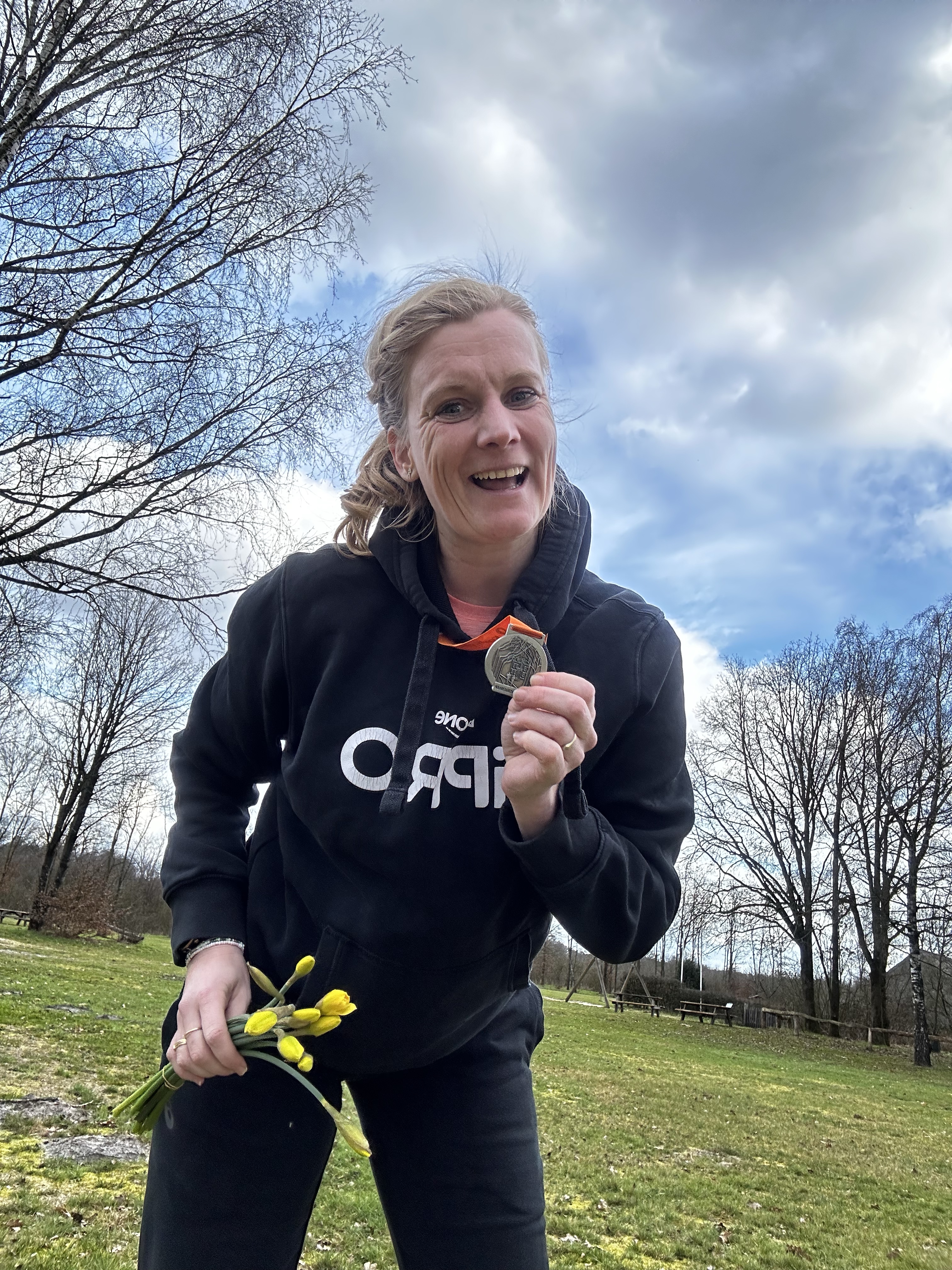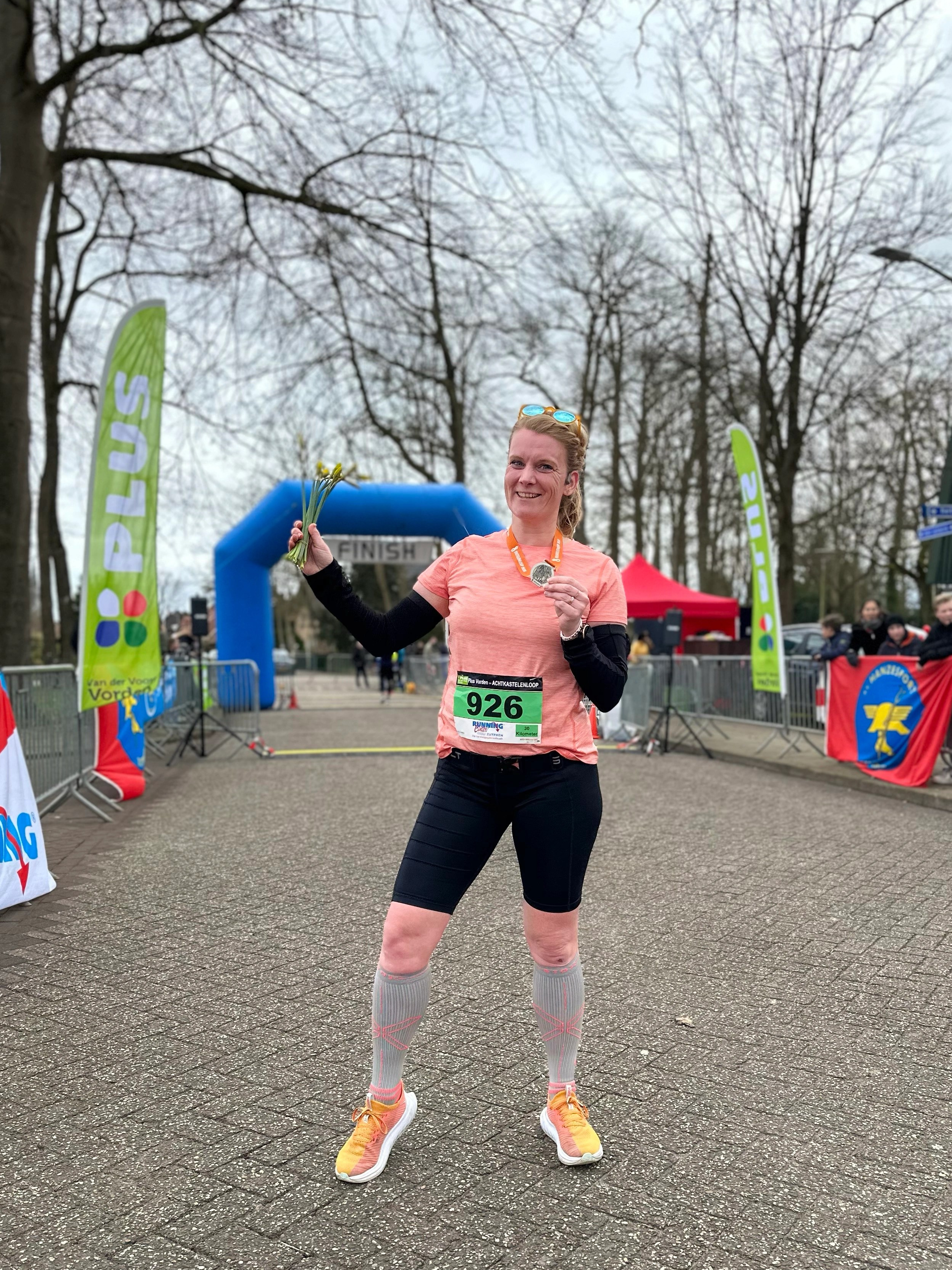 De dame van de EHBO wil nog wel even een foto van mij maken en dan loop ik richting de medailles. Daar krijg ik eerst een klein bosje met narcissen. Wat ik enorm leuk vindt, ik hou van bloemen! De medaille vind ik ook erg mooi maar vooral ben ik blij op hoe de race is gegaan. Hoe ik dit gelopen heb en hoe ik me voelde in de laatste 5 kilometer. Ik heb niet gewandeld, ik heb wel genoten en dat zonder al dat publiek wat bijvoorbeeld in London was. Mijn tijd, daar had ik niet van durven dromen en achteraf denk ik zelfs mijn 30 km PR. Ik weet het niet want ergens is het mijn eerste 30 km wedstrijd, dus ik zoek mijn tussentijden van mijn Marathon PR op. Tijdens mijn snelste marathon, heb ik de 30 km gelopen in 2.45,17. Dus bij deze is het mijn PR en die staat nu dus op 2.44,21. Ik ben er echt heel blij mee! Wat ik ook echt heel leuk vond vandaag, het sociale stukje, ik heb weer zoveel mensen leren kennen, maar ook ‘instavriendjes’ in het echt mogen ontmoeten en onderweg leuke gesprekjes gehad.