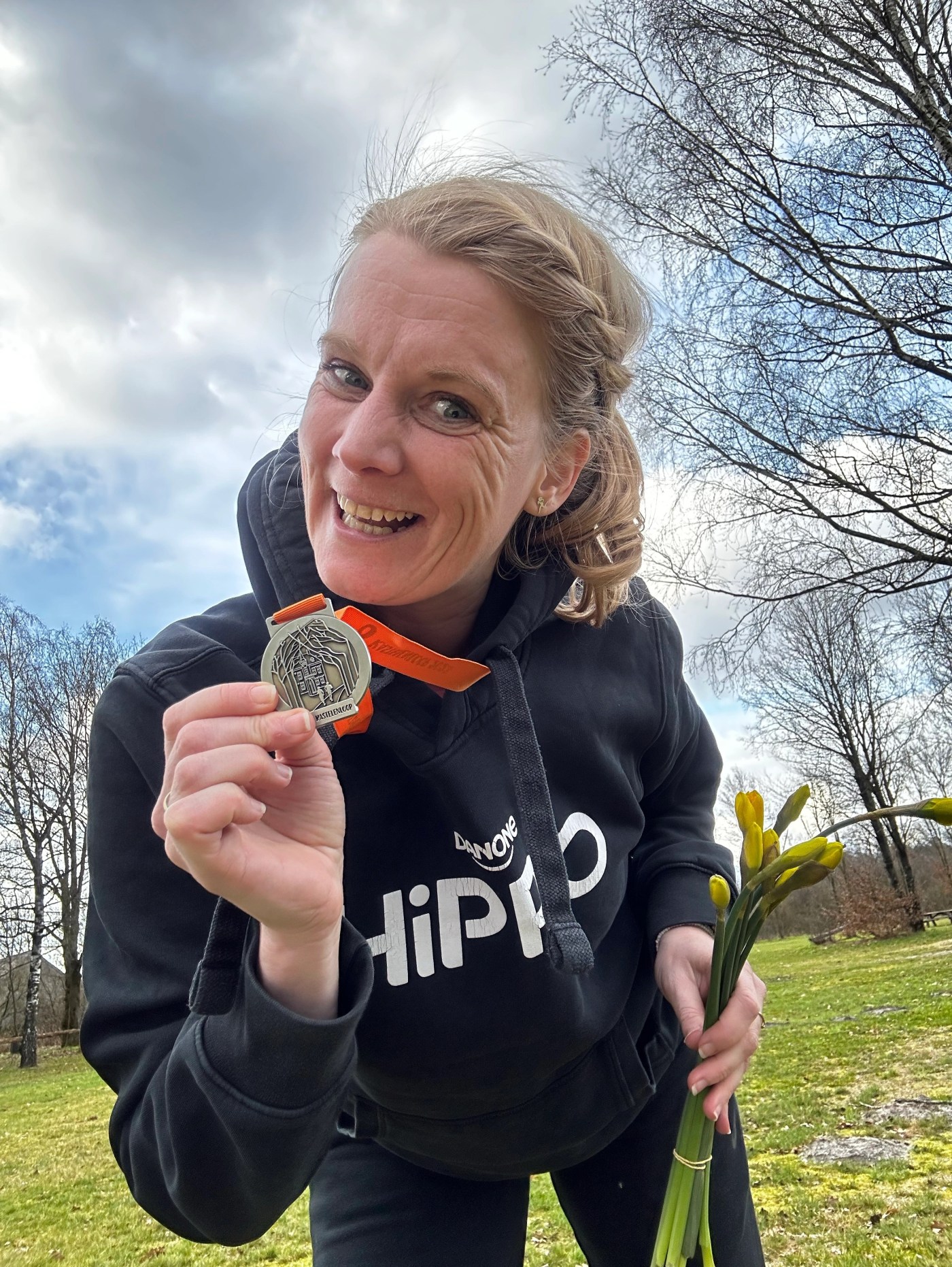 De dame van de EHBO wil nog wel even een foto van mij maken en dan loop ik richting de medailles. Daar krijg ik eerst een klein bosje met narcissen. Wat ik enorm leuk vindt, ik hou van bloemen! De medaille vind ik ook erg mooi maar vooral ben ik blij op hoe de race is gegaan. Hoe ik dit gelopen heb en hoe ik me voelde in de laatste 5 kilometer. Ik heb niet gewandeld, ik heb wel genoten en dat zonder al dat publiek wat bijvoorbeeld in London was. Mijn tijd, daar had ik niet van durven dromen en achteraf denk ik zelfs mijn 30 km PR. Ik weet het niet want ergens is het mijn eerste 30 km wedstrijd, dus ik zoek mijn tussentijden van mijn Marathon PR op. Tijdens mijn snelste marathon, heb ik de 30 km gelopen in 2.45,17. Dus bij deze is het mijn PR en die staat nu dus op 2.44,21. Ik ben er echt heel blij mee! Wat ik ook echt heel leuk vond vandaag, het sociale stukje, ik heb weer zoveel mensen leren kennen, maar ook ‘instavriendjes’ in het echt mogen ontmoeten en onderweg leuke gesprekjes gehad.