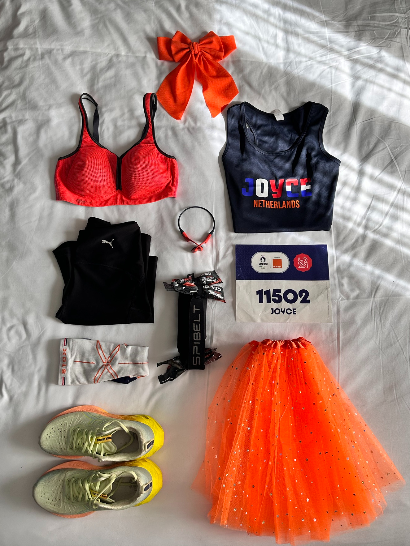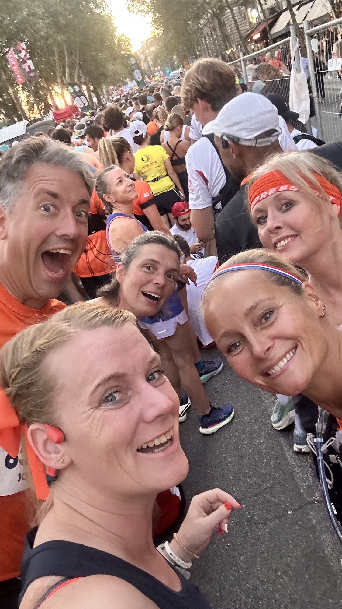 Vroeg opgestaan zodat we bij het verzamelpunt van de atletiekunie konden gaan staan in de oranje fan zone om zo de mannen aan te moedigen tijdens de marathon. Daarna rustig aan gedaan deze dag. In de middag vooral op bed gelegen terwijl mijn man een beetje Parijs aan het verkennen was. Helaas lukte het mij niet om te slapen, dus met mijn ogen dicht al denkend en hopend dat ik zou slapen een aantal uren op bed gelegen. Rond half 5 kwam manlief er ook even bij en om 17.00 uur begon ik rustig met mijn voorbereiding. Negen uur was de start van de marathon, naar verwachting zou ik rond 21.30 uur starten met rennen. Het probleem waar ik nog geen oplossing voor had gevonden was het avondeten. We besloten eerst naar de start te reizen en daar in de omgeving wat te gaan eten. Dat was mogelijk niet ons beste besluit, want het was er al druk en bijna alle restaurants zaten vol. Niet gek wan het is zaterdagavond. Ik wilde iets met brood en dat is op een avond kaart ook beperkt. Het eerste restaurant waar we gingen zitten hadden geen brood meer dus daar zijn we weer vertrokken. Gelukkig het restaurant er tegen over had het nog wel. Terwijl manlief een lekker stukje vlees at, at ik een kale club sandwich (brood sla kip en saus). Voor mij was dit prima, wit brood dus lekker wat koolhydraten, daarnaast kon ik me rustig verder klaar maken daar. Ik trok mijn tutu aan, mijn compressie kousen. Rond half 9 liep ik naar mijn startvak, de bandjes werden (beperkt) gecontroleerd waardoor veel andere mensen in de buurt van de startvakken liepen, daarmee bedoel ik niet renners, mensen met fietsen, kinderwagens, kleine kinderen aan de hand om mama of papa uit te zwaaien. Persoonlijk vond ik hier wat van en dit maakte dat ik over 100 meter bijna 10 minuten bezig was, wat niet lekker voelt voor een wedstrijd. Uiteindelijk in het startvak had ik alle ruimte en zag al snel een paar Nederlanders uit de app groep en samen gingen we op weg naar de start.
