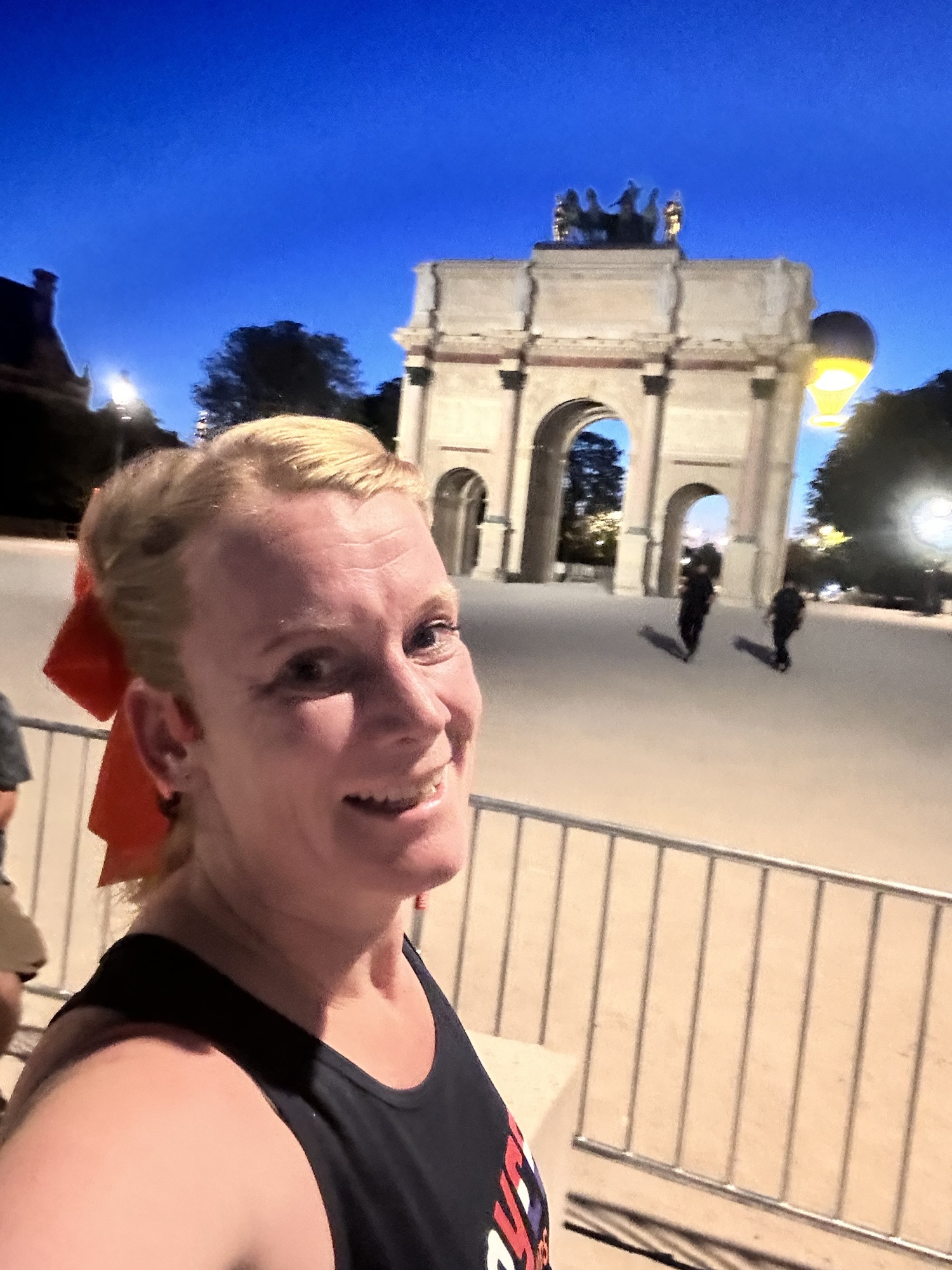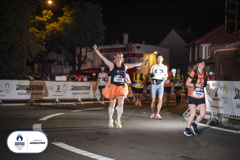 Terwijl ons startvak zachtjes richting de start wandelt klinkt met toeval het Franse volkslied (bij hotel de Ville was een supporterspunt waar je wedstrijden kon kijken, dat was dus bij de start en er begon net een wedstrijd waar de Franse ploeg aan deel nam). Dit was een kippenvel momentje, net als de start want toen besefte ik me dat alles echt was, Ik doe mee aan de eerste marathon race tijdens de olympische spelen, op hetzelfde parcours als de Elite lopers. De eerste 5 km liep ik lekker, ondanks dat ik het echt warm had, de zon was net onder, maar het was nog steeds 27 graden. Ik ben geen warmweer loper en het zweet kwam helaas nog niet los. We liepen langs de olympische vlam en het louvre, daar was een eerste stop want ik wilde een foto maken. Vervolgens ging ik door en zag aan mijn linkerkant een schitterende knipperende Eifeltoren, dus daar ook gestopt en een foto gemaakt. Ik had het na 5 km alleen al zwaar en dat merkte ik enorm in mijn hoofd en gedachten. Ik maakte de afstand nog groter dan het is, maar was vooral ook bang dat het niet zou gaan lukken. Op 10 km stond mijn man, blij te filmen, dat filmpje was niet het vrolijke filmpje wat ik op Instagram zou delen, maar ik stopte (wat ik anders niet doe) bij hem en zei dat het niet goed ging. Ik kreeg nog te horen, dat is niet erg probeer te genieten ik ga naar de finish en ga daar op je wachten. Tijd om door te rennen en dat deed ik. In mijn tutu besloot ik wat vrolijke muziek op te zetten. Ik kreeg direct een paar leuke nummers te horen, wat me uit de negatieve gedachte haalde. Ik besloot om mee te gaan zingen, sorry voor de rest maar dit is wat me nu even helpt. Mijn gedachten gingen op positief en ik hoorde ineens het publiek .. Allez tutu zeggen, ik keek om mee heen en besefte dat ze mij aan het aanmoedigen waren. Ik heb me ook echt verbaasd over de hoeveelheid mensen die zo laat op de avond daar toch maar stonden om ons aan te moedigen.