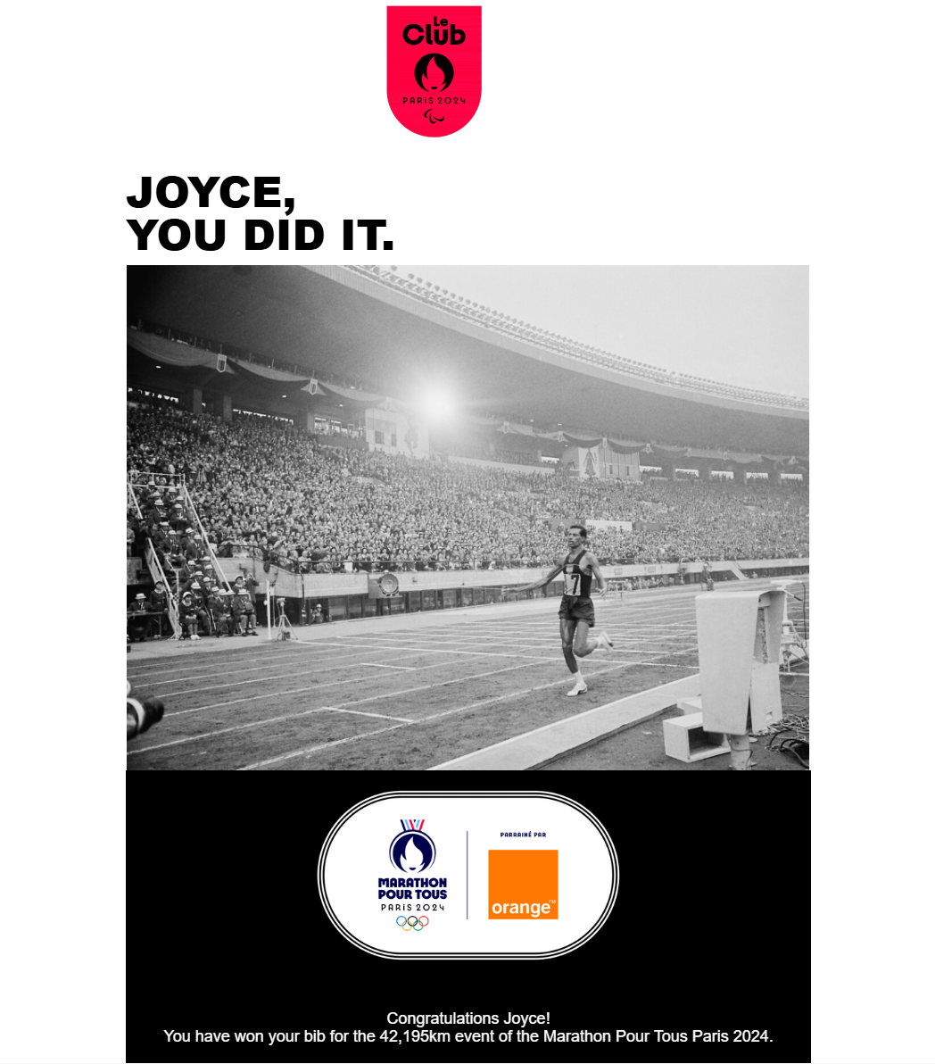 De Marathon pour Tous was voor iedereen toegankelijk maar een kaartje kopen kon je er niet voor. In het najaar van 2021 las ik via, (ik denk) de Runnersworld dat je kans kon maken op een startbewijs door een app te downloaden en deel te nemen aan de uitdagingen die werden gesteld in de app. Zo gezegd zo gedaan t/m januari 2024. Bij iedere challenge had je kans op een startbewijs. Ik heb aan veel challenges/uitdagingen mee gedaan en eind januari zouden de laatste gelukkigen een mail krijgen. Helaas, ik was niet geselecteerd in de afgelopen 1,5 jaar. Een andere optie was heel veel punten sparen en op die wijze ingeloot worden (door verschillende challenges/uitdagingen doen, maar ook op websites te kijken etc.). Ook via die weg werd ik niet geselecteerd. Ik heb aan winacties van zowel de hele marathon als de 10 km meegedaan zonder succes. Hoe ik dan wel ineens kon mee doen? Dat antwoord moet ik jullie helaas schuldig blijven, want ik weet het zelf ook niet. Toch kreeg ik op 5 april 2024 ineens het bericht dat ik een startbewijs had gewonnen. De e-mail zelf en het emailadres zag er echt uit, maar toch heb ik van alles gecheckt om zeker te zijn dat het geen phishing was want ik vond het onwerkelijk dat ik nu nog dit bericht zou krijgen. Na een uurtje speuren, de gok genomen en me geregistreerd, enkele dagen en een medisch certificaat later was het officieel, ik was een van de gelukkigen die de olympische marathon van Parijs zou gaan rennen!